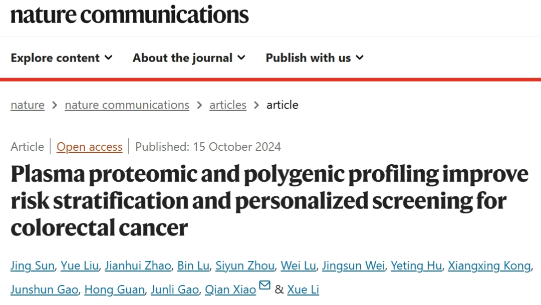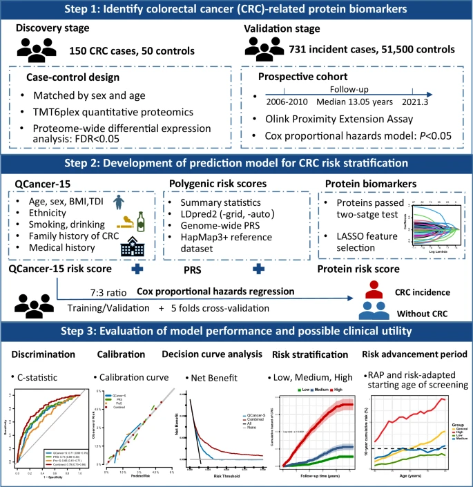 科研进展 | 浙江大学医学院附属第二医院突破:血浆蛋白质组学携手多基因分析,革新结直肠癌风险评估发表时间:2024-10-15 20:50 【导读】这项研究旨在通过将蛋白质组学特征与遗传和非遗传因素(QCancer-15)相结合,确定结直肠癌(CRC)相关的蛋白质组学特征并开发CRC发病预测模型,以改善风险分层和个性化初始筛查年龄的估计。